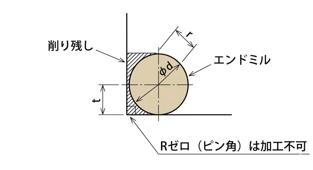 この「円柱状の工具を回転させる」という物理的な原理上、工具の軌跡は必ず円弧を描きます。したがって、四角いポケット(くぼみ)を削り出した場合、四隅には必ず工具の半径(R)と同じサイズの削り残しが発生します。