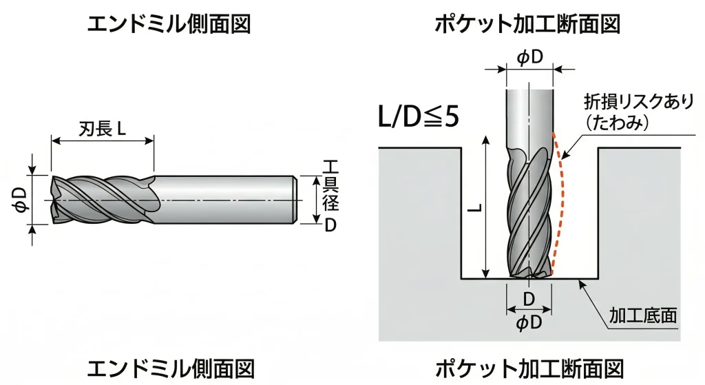 これは、エンドミルの刃長(加工する深さ:L)と、工具の直径(D)の比率を表します。金属加工の業界標準として、「L/D は 5 以下(L/D ≦ 5)に抑える」のが安全に加工できる限界とされています。