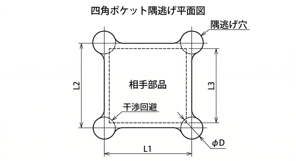 エンドミルで四角いポケットを削る前に、四隅の交点(本来ピン角になるはずだった頂点)に対してドリルで穴をあけておきます。その後、エンドミルで直線部分を切削することで、角の削り残し部分がドリル穴の中に吸収され、相手部品が干渉せずに入るようになります。