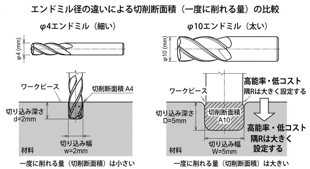 工具径が太い(=隅Rが大きい)エンドミルは、剛性が高いため「一度に深く(切り込み量大)」「速く(送り速度大)」削ることができます。